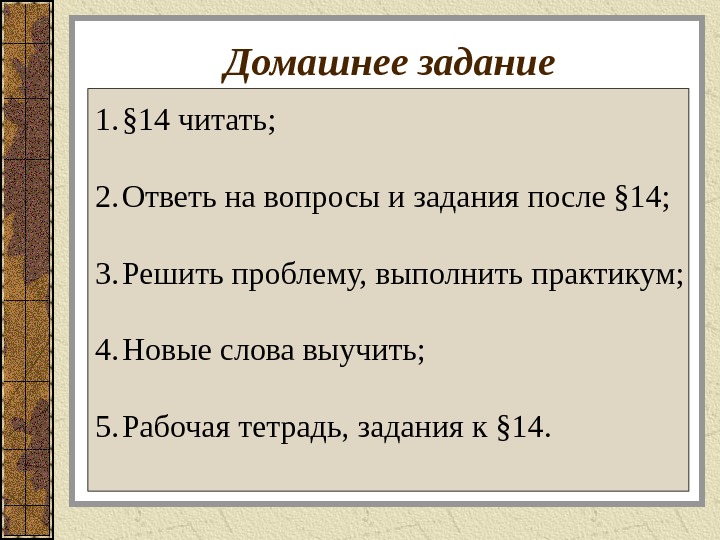 Домашнее задание 1. § 14 читать; 2. Ответь