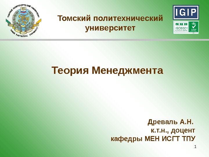 1 Теория Менеджмента Томский политехнический университет Древаль А.