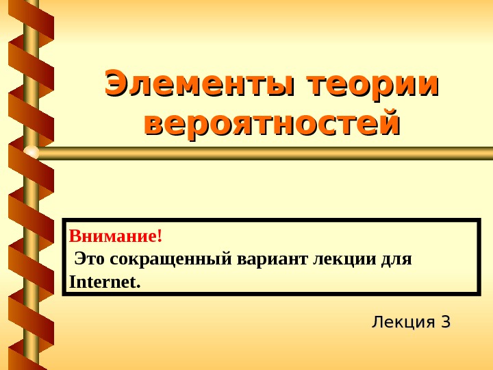 Элементы теории вероятностей Лекция 3 Внимание! Это