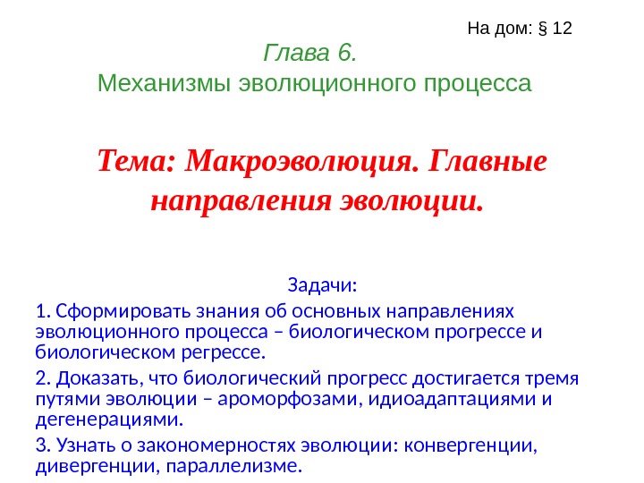 Задачи: 1. Сформировать знания об основных направлениях эволюционного