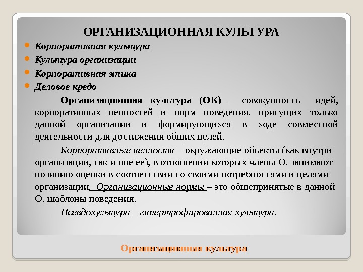 Организационная культура. ОРГАНИЗАЦИОННАЯ КУЛЬТУРА Корпоративная культура
