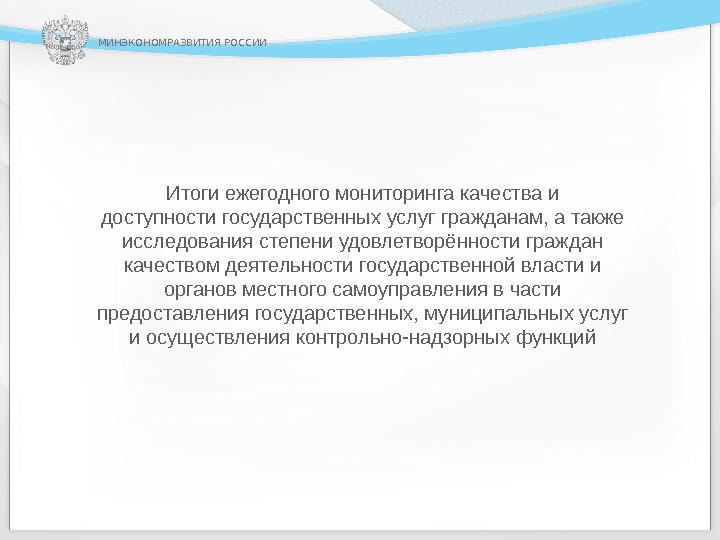 МИНЭКОНОМРАЗВИТИЯ РОССИИ Итогиежегодногомониторингакачестваи доступностигосударственныхуслуггражданам, атакже исследованиястепениудовлетворённостиграждан качествомдеятельностигосударственнойвластии органовместногосамоуправлениявчасти