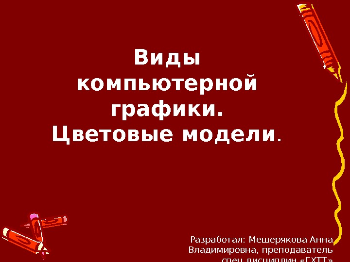 Виды компьютерной графики. Цветовые модели. Разработал: Мещерякова Анна