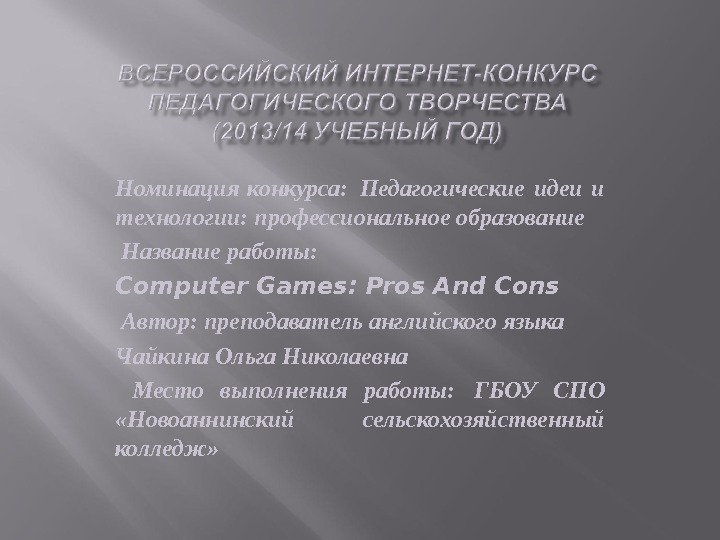 Номинация конкурса: Педагогические идеи и технологии: профессиональное