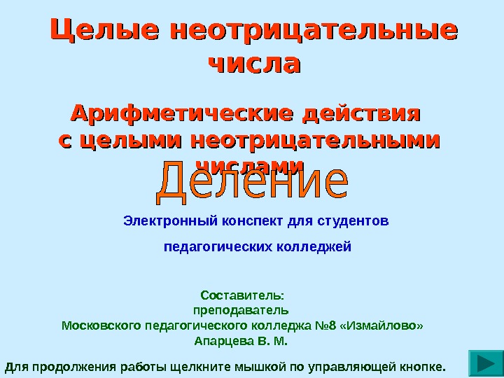 Целые неотрицательные числа Составитель: преподаватель Московского педагогического колледжа