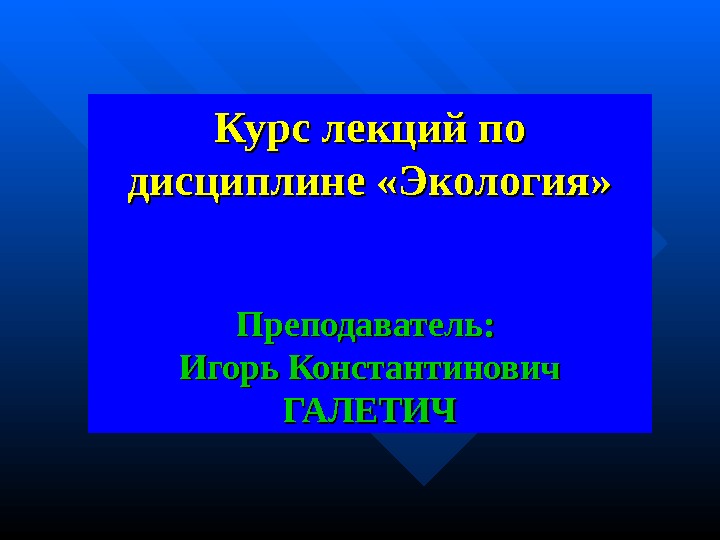 Курс лекций по дисциплине «Экология» Преподаватель: Игорь
