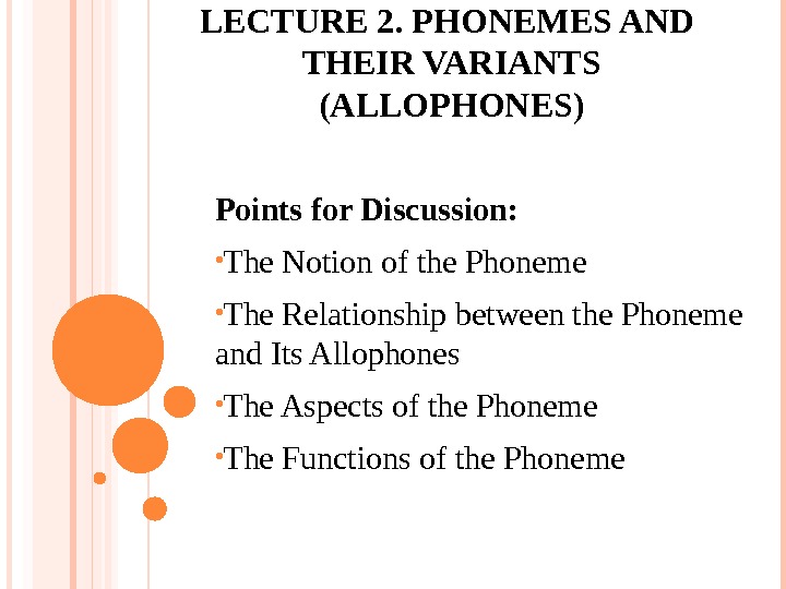 LECTURE 2. PHONEMES AND THEIR VARIANTS (ALLOPHONES) Points