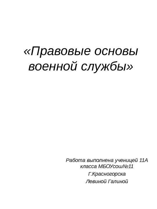 «Правовые основы военной службы» Работа выполнена ученицей