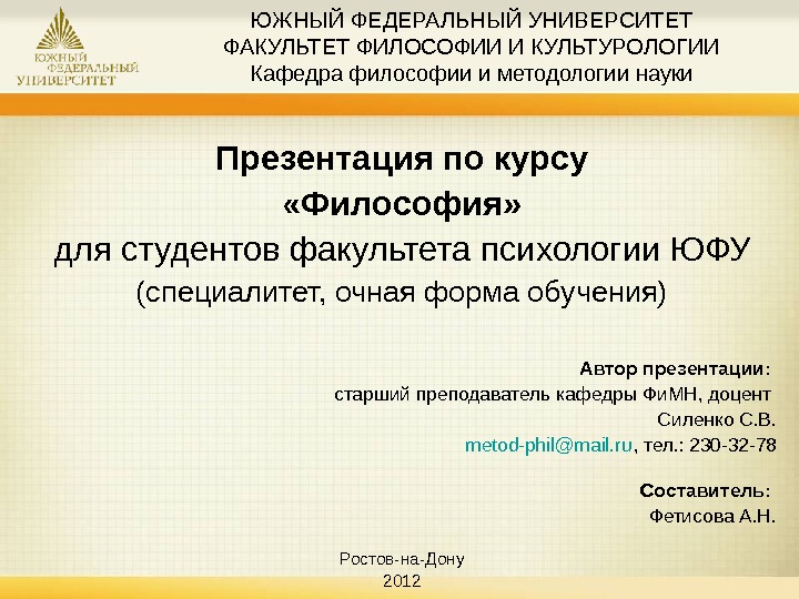 ЮЖНЫЙ ФЕДЕРАЛЬНЫЙ УНИВЕРСИТЕТ ФАКУЛЬТЕТ ФИЛОСОФИИ И КУЛЬТУРОЛОГИИ Кафедра