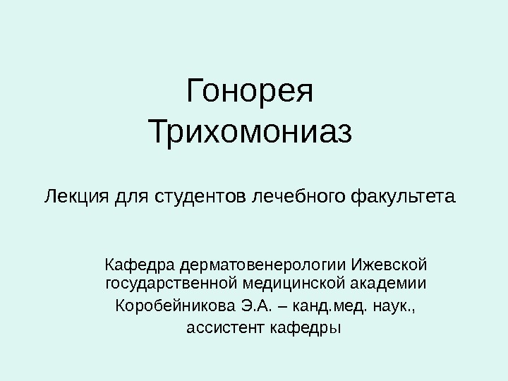 Гонорея Трихомониаз Лекция для студентов лечебного факультета Кафедра