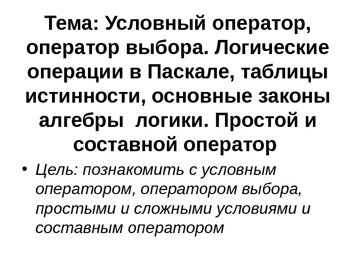 Тема: Условный оператор, оператор выбора. Логические операции