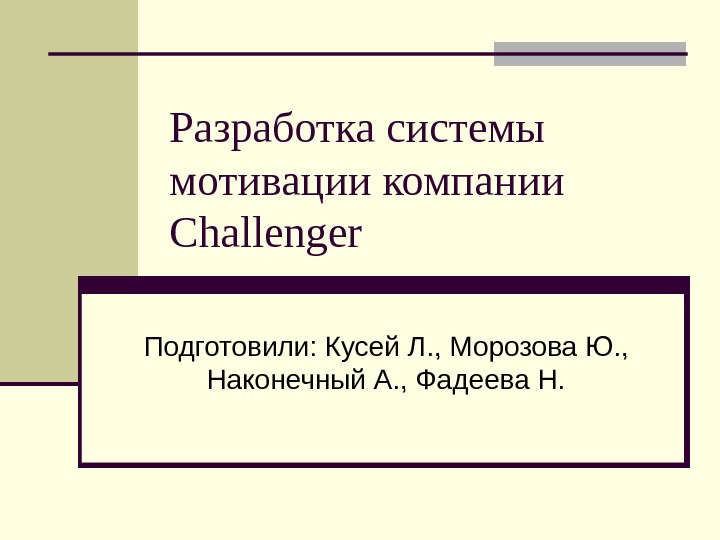 Разработка системы мотивации компании Challenger Подготовили: Кусей Л.