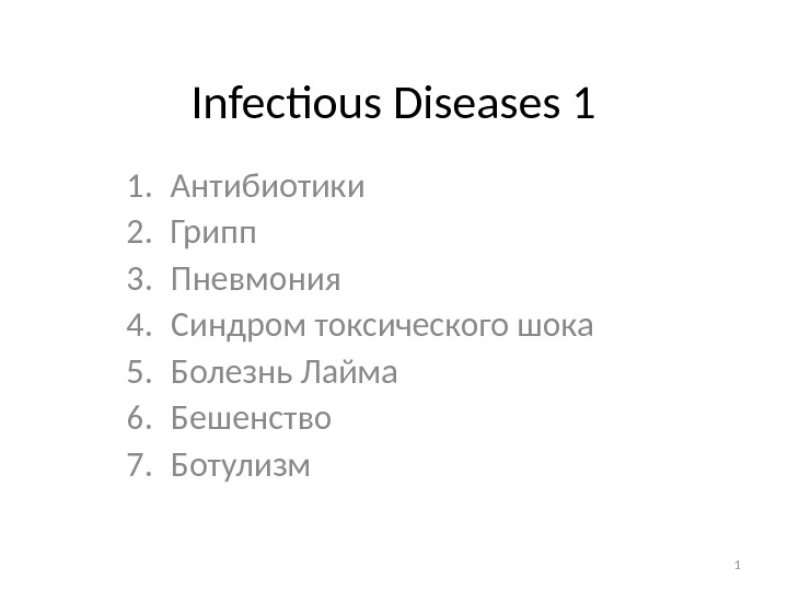 Infectious Diseases 1 1. Антибиотики 2. Грипп 3.