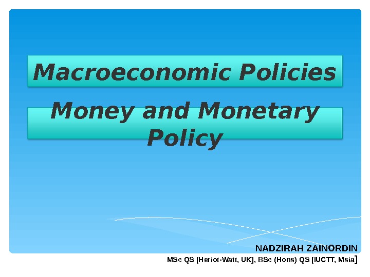 Macroeconomic Policies Money and Monetary Policy NADZIRAH ZAINORDIN