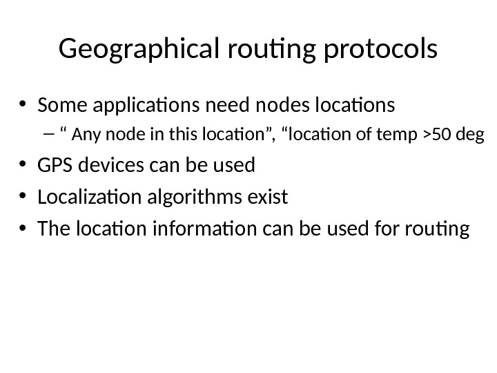 Geographical routing protocols • Some applications need