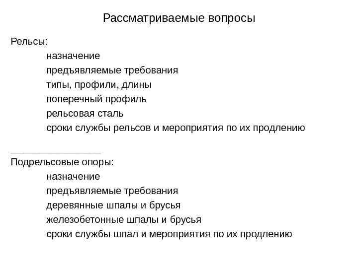 Рассматриваемые вопросы Рельсы: назначение предъявляемые требования типы, профили,