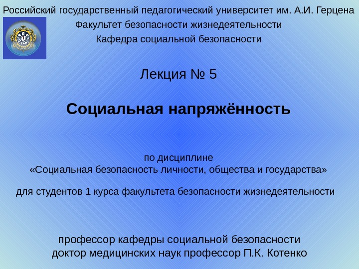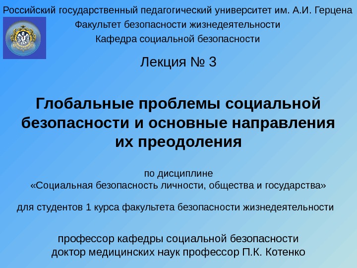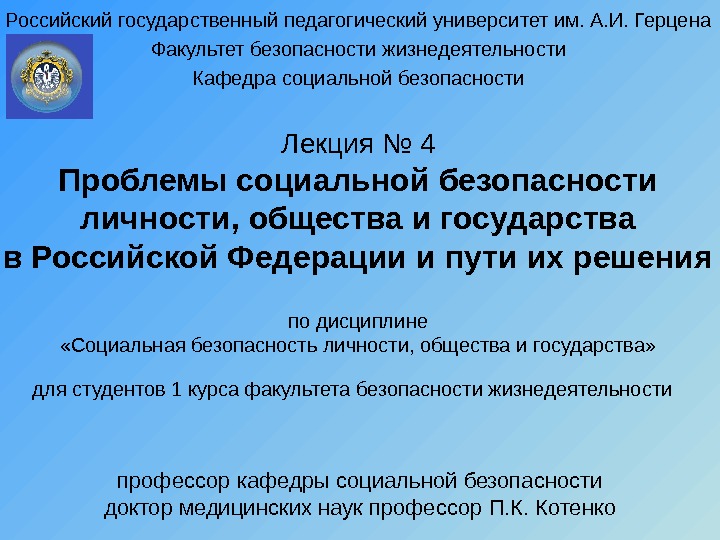 Лекция № 4 Проблемы социальной безопасности личности, общества
