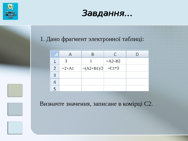 Завдання …… 1. Дано фрагмент электронної таблиці: