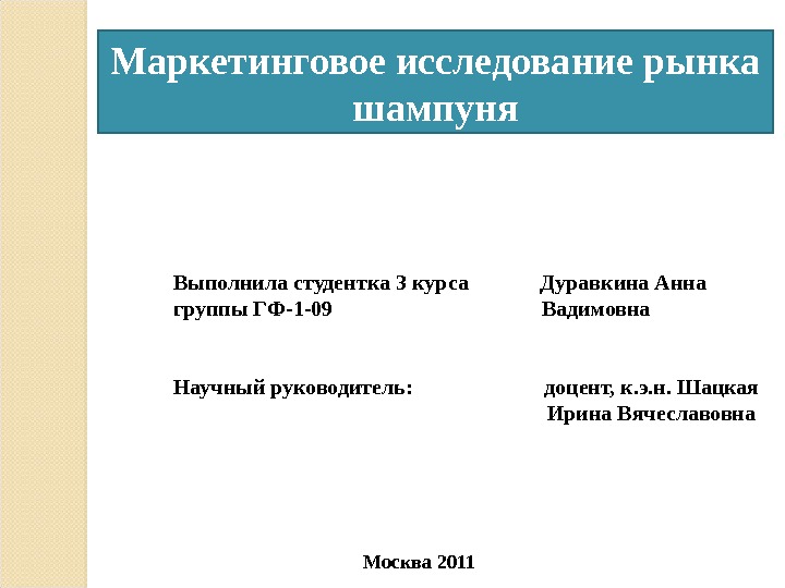 Маркетинговое исследование рынка шампуня Выполнила студентка 3 курса