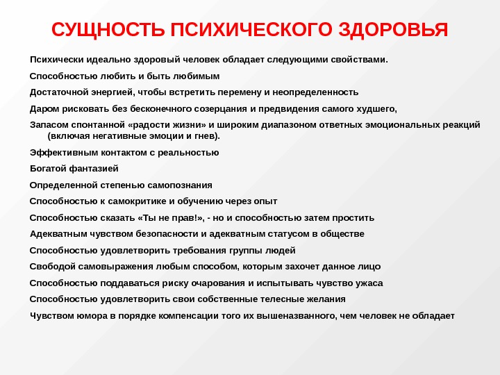 СУЩНОСТЬ ПСИХИЧЕСКОГО ЗДОРОВЬЯ Психически идеально здоровый человек обладает