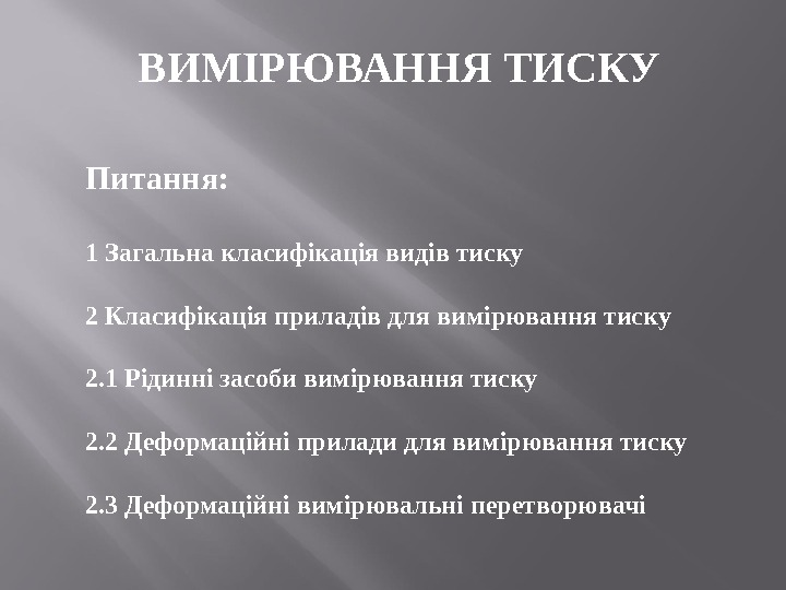 ВИМІРЮВАННЯ ТИСКУ Питання: 1 Загальна класифікація видів тиску