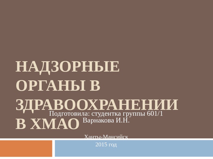 НАДЗОРНЫЕ ОРГАНЫ В ЗДРАВООХРАНЕНИИ В ХМАО Подготовила: студентка