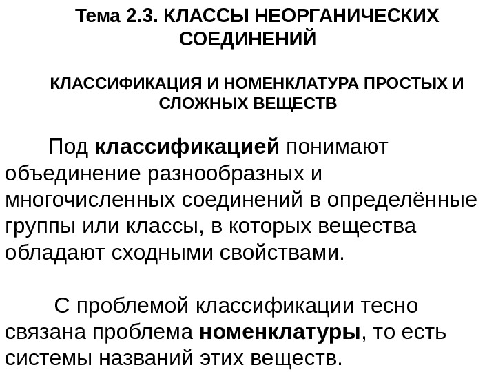 Тема 2. 3. КЛАССЫ НЕОРГАНИЧЕСКИХ СОЕДИНЕНИЙ КЛАССИФИКАЦИЯ И