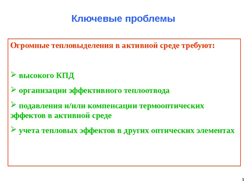 1 Ключевые проблемы Огромные тепловыделения в активной среде
