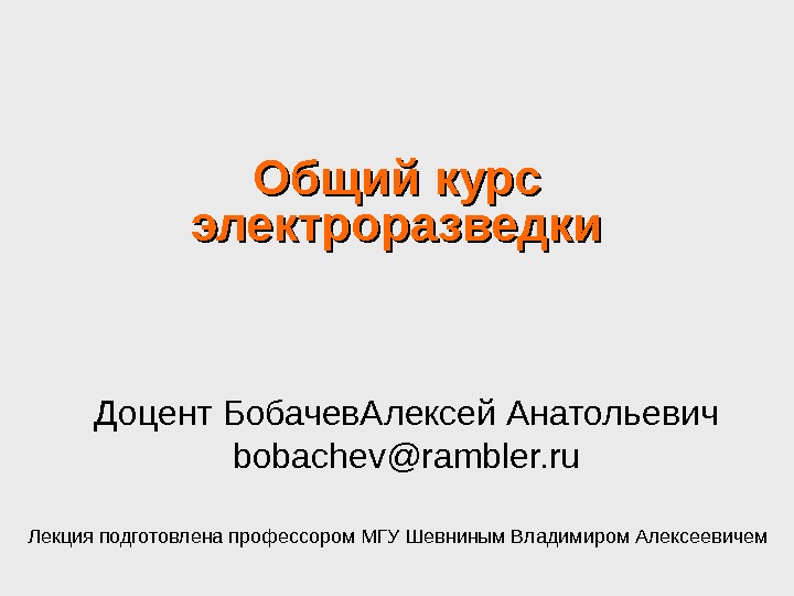 Общий курс Общий курс электроразведкиэлектроразведки Доцент БобачевАлексей Анатольевич bobachev @rambler.ru Лекция подготовлена профессором МГУ Шевниным Владимиром Алексеевичем (26) 2Разнообразие видов