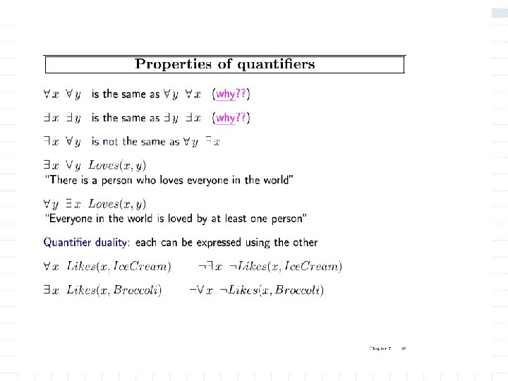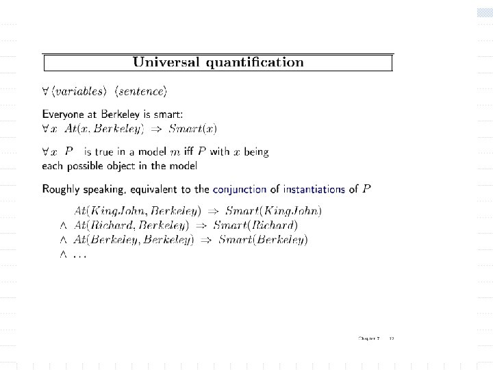 Quantification w Universal and existential quantifiers allow expressing general rules with variables w Universal quantification n All cats are mammals w n It is equivalent to the conjunction of all the sentences obtained by substitution the name of an object for the variable x. w Syntax: if w is a wff then (forall x) w is a wff.