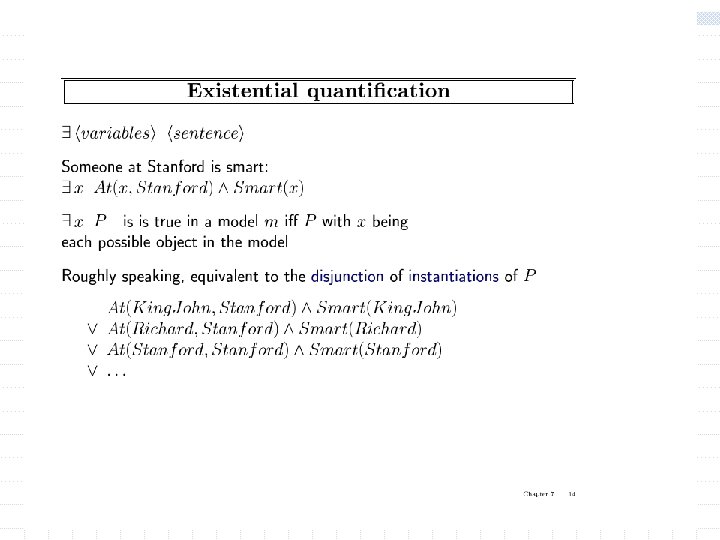 Quantification: Existential w Existential quantification : an existentially quantified sentence is true in case one of the disjunct is true w Equivalent to disjunction: w We can mix existential and universal quantification.