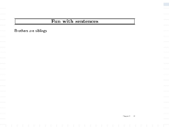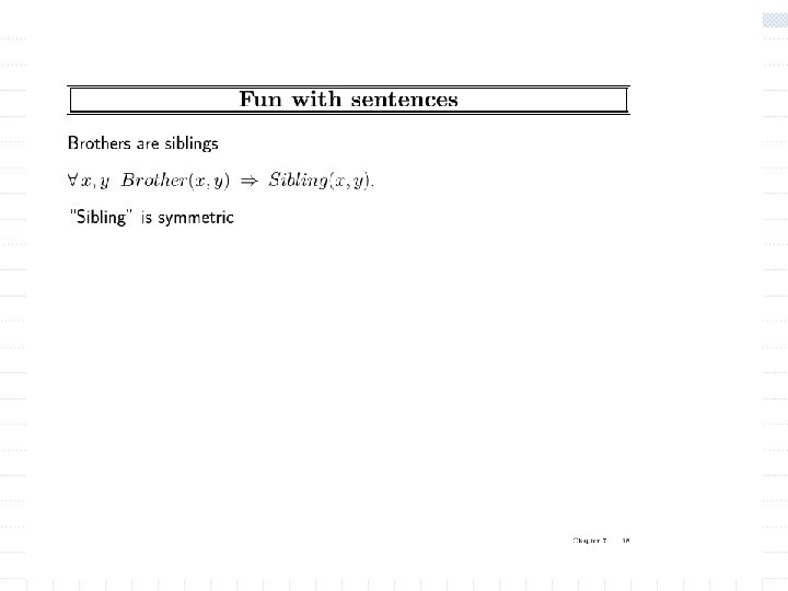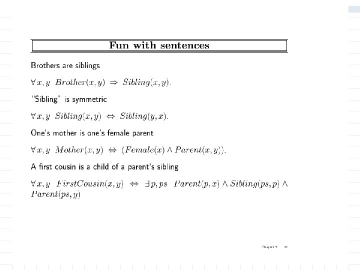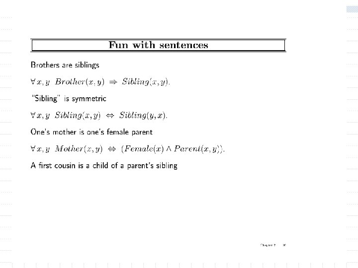 Using FOL w The kinship domain: n n object are people Properties include gender and they are related by relations such as parenthood, brotherhood, marriage predicates: Male, Female (unary) Parent, Sibling, Daughter, Son. . . Function: Mother Father w Brothers are siblings x, y Brother(x, y) Sibling(x, y) w One's mother is one's female parent m, c Mother(c) = m (Female(m) Parent(m, c)) w “Sibling” is symmetric