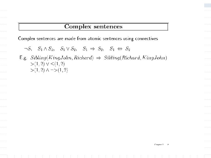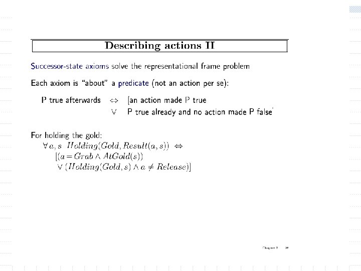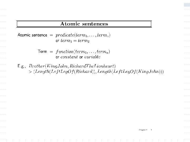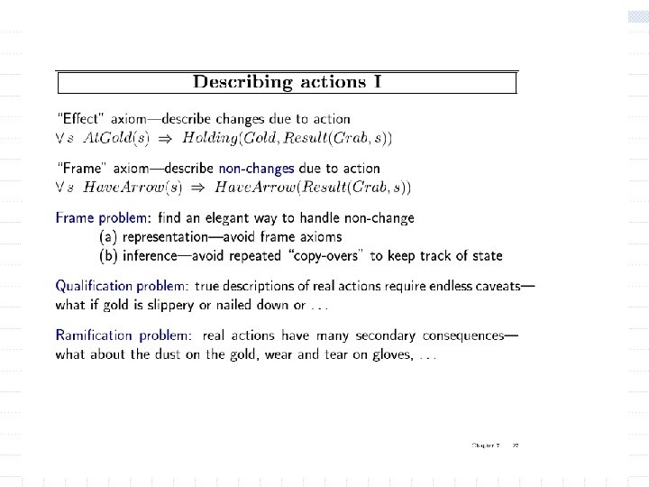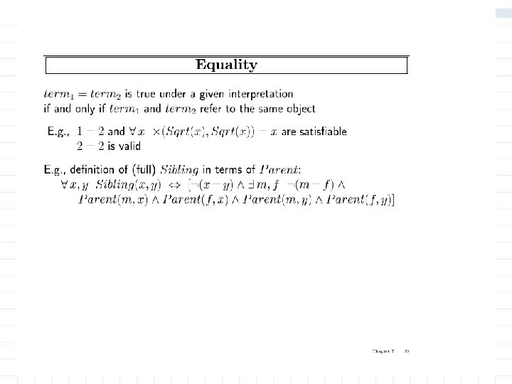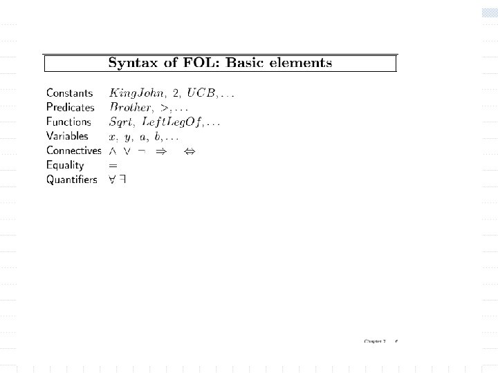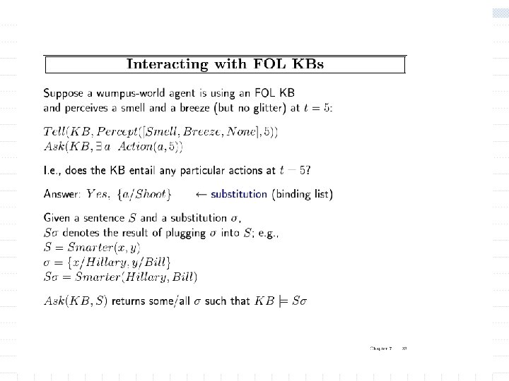 Using FOL The set domain: w s Set(s) (s = {} ) ( x, s 2 Set(s 2) s = {x|s 2}) w x, s {x|s} = {} w x, s x s s = {x|s} w (the only members of a set are the elements that were adjoint into it) w x, s x s [ y, s 2} (s = {y|s 2} (x = y x s 2))] w s 1, s 2 s 1 s 2 ( x x s 1 x s 2) Objects are (s w s 1, s 2 (s 1 = s 2) sets 1 s 2 s 1) Predicates: unary predicate “set: , binary predicate membership (x is a member of set), (x s subset of s 2) w x, s 1, s 2 x (s 1 s 2) “subset” 1 (s 1 is a 2) Functions: intersections, union, adjoining an eleiment to a set. w x, s 1, s 2 x (s 1 s 2) (x s 1 x s 2)