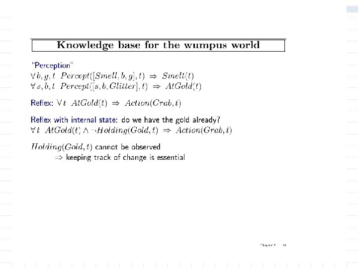 Summary w First-order logic: n objects and relations are semantic primitives n syntax: constants, functions, predicates, equality, quantifiers w Increased expressive power: sufficient to define wumpus world