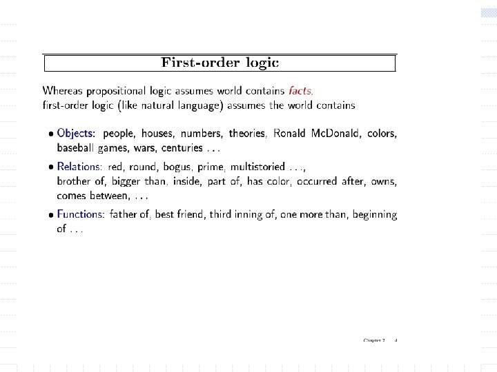Outline w New ontology n objects, relations, properties, functions. w New Syntax n Constants, predicates, properties, functions w New semantics n meaning of new syntax w Inference rules for Predicate Logic (FOL) n Resolution n Forward-chaining, Backword-chaining n unification w Readings: Nillson’s Chapters 15 -16, Russel and Norvig Chapter 8, chapter 9