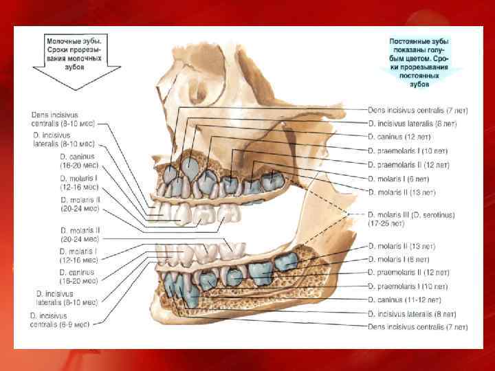Сроки прорезывания постоянных зубов: ВРЕМЯ ПРОРЕЗЫВАНИЯ Верхние зубы НАЗВАНИЕ ЗУБА Центральный резец 6 -8 лет Боковой резец 8 -9 лет Клык 10 13 лет Первый премоляр 10 -12 лет Второй премоляр 11 -13 лет Первый моляр 6 -7 лет Второй моляр Различные сроки Третий моляр Различнее сроки Нижние зубы Третий моляр Различные сроки Второй моляр 12 -13 лот Первый моляр 6 -7 лет Второй премоляр 11 -13 лег Первый премоляр 9 -11 лет Клык 10 -13 лет Боковой резец 8 9 лег Центральный резец 6 -8 лет