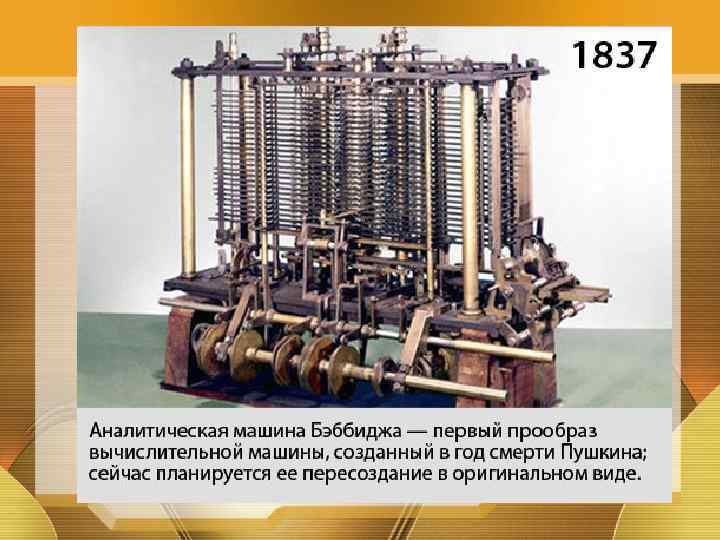 Аналитическая машина По замыслу Аналитическая машина Бэббиджа должна была производить разнообразные вычисления, следуя набору инструкций.