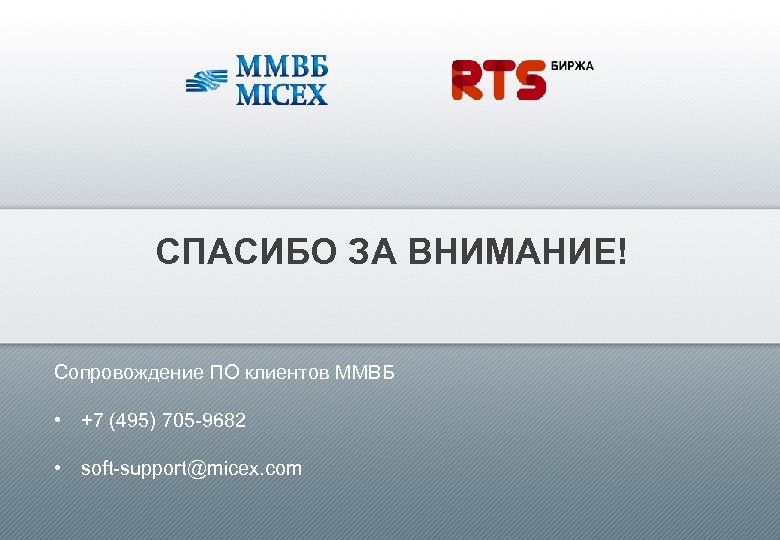 СПАСИБО ЗА ВНИМАНИЕ! Сопровождение ПО клиентов ММВБ • +7 (495) 705 -9682 • soft-support@micex. com