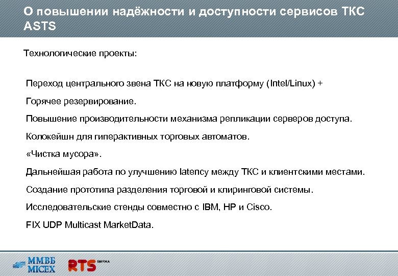 О повышении надёжности и доступности сервисов ТКС ASTS Технологические проекты: Переход центрального звена ТКС на новую платформу (Intel/Linux) + Горячее резервирование. Повышение производительности механизма репликации серверов доступа. Колокейшн для гиперактивных торговых автоматов. «Чистка мусора» . Дальнейшая работа по улучшению latency между ТКС и клиентскими местами. Создание прототипа разделения торговой и клиринговой системы. Исследовательские стенды совместно с IBM, HP и Сisco. FIX UDP Multicast Market. Data.