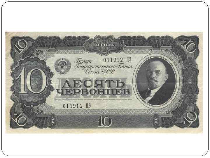 Финансы эпохи НЭП В 1922 г. началась денежная реформа. В обращение была выпущена устойчивая валюта – советский червонец, применявший ся для краткосрочного кредитова ния в промышленности и торговле. Червонец обеспечивался золотом и другими легко реализуемыми ценностями и товарами. Один червонец приравнивался к 10 дореволюционным золотым рублям, а на мировом рынке он стоил около 6 долларов