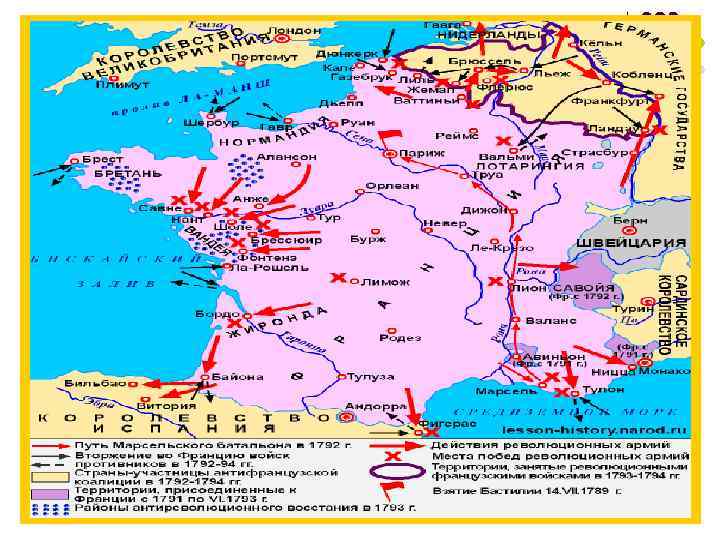 2. Великая Французская революция l 20 апреля 1792 Франция объявила войну Австрии. В том же году в войну с революционной Францией вступили Пруссия и Сардинское королевство, в 1793 — Великобритания, Нидерланды, Испания, Неаполитанское королевство, германские государства и др.