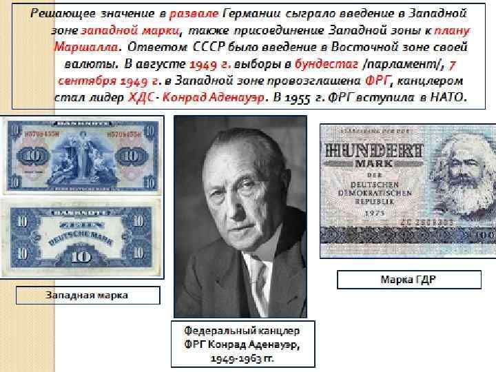 7 сентября 1949 г. – создание ФРГ Бундестаг и бундесрат одобрили конституцию и избрали президента Федеративной Республики Германии, а 20 сентября лидер Христианско – демократического союза Конрад Аденауэр представил парламенту первое правительство ФРГ.