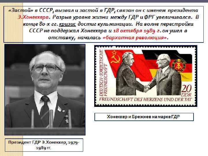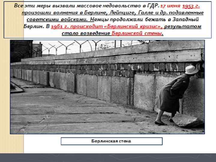 7 октября 1949 г. – провозглашение ГДР. События в Восточной Германии развивались по аналогии. Была введена восточная марка в советской зоне. Политическая партия Восточной Германии( среди которых главную роль играла Социалистическая единая партия Германии), сформировали Немецкий национальный совет, который на заседании 7 октября 1949 года провозгласил создание Германской Демократической Республики на территории восточной зоны. . 12 октября палата ( временный парламент) избрали президентом ГДР Отто Громвеля.