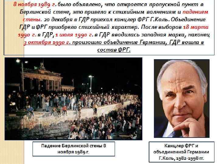 Экономическое и политическое развитие ФРГ в 1949 – 1990 гг. ► С 1982 по 1998 гг. возглавил правительство ( неоконсерватизм) Провозгласил возвращение к политике Л. Эрхарда, но признал необходимость со стороны государства социальной корректировки стихийно действующего рыночного механизма. ► Провёл приватизацию малоэффективных сфер экономики ► Оказана поддержка развитию новых технологий ► Гельмут Коль
