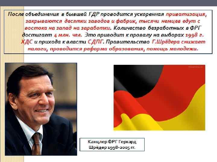 Экономическое и политическое развитие ФРГ в 1949 – 1990 гг. ►В 1998 году СДПГ победила на парламентских выборах и канцлером стал социал – демократ Г. Шрёдер Герхард Шрёдер
