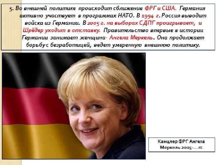 Объединение Германии в 1990 г. Политика Шрёдера - Продолжил политику Г. Коля Наметилось тенденция на сближение позиций двух ведущих сил Германии Начата реформа образования Были сокращены пособия по безработице. Но увеличены расходы на науку и образование Снижены налоги на малый бизнес Были приняты программы для поощрения добровольных организаций граждан в помощи старикам и инвалидам