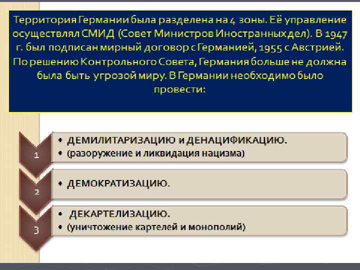 Крымская ( Ялтинская ) Конференция 1945 г. Представители: И. Сталин, У. Черчилль, Ф. Рузвельт Международные конференции в Ялте и Постдаме определили следующую политику по отношению к Германии: 1) денацификация 2) демилитаризация 3) декартелизация 4) демократизация