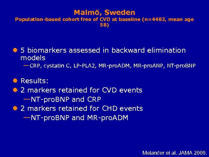 Malmö, Sweden Population-based cohort free of CVD at baseline (n=4483, mean age 58) l 5 biomarkers assessed in backward elimination models — CRP, cystatin C, LP-PLA 2, MR-pro. ADM, MR-pro. ANP, NT-pro. BNP l Results: l 2 markers retained for CVD events —NT-pro. BNP and CRP l 2 markers retained for CHD events —NT-pro. BNP and MR-pro. ADM Melander et al. JAMA 2009.
