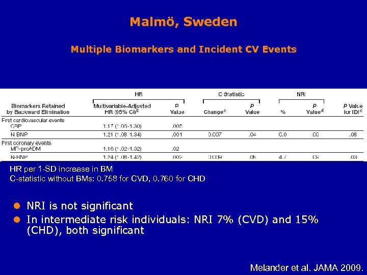 Malmö, Sweden Multiple Biomarkers and Incident CV Events HR per 1 -SD increase in BM C-statistic without BMs: 0. 758 for CVD, 0. 760 for CHD l NRI is not significant l In intermediate risk individuals: NRI 7% (CVD) and 15% (CHD), both significant Melander et al. JAMA 2009.