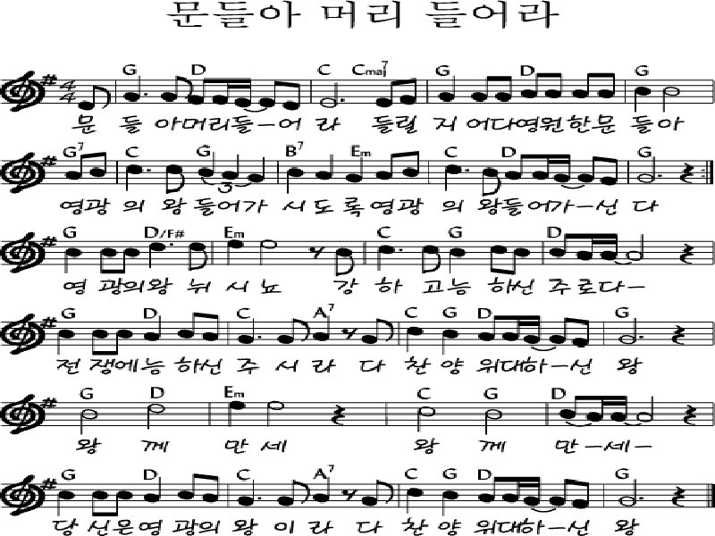 사회자: 영광의 왕이 뉘시냐? 힘이 세고 용맹하신 주님이시다. 전쟁의 용사이신 주님이시다. Leader: Who is this King of glory? The LORD strong and mighty, the LORD mighty in battle. 회 중: 문들아, 너희 머리를 들어라. 영원한 문들아, 활짝 열 려라. 영광의 왕께서 들어가신다. Congregation: Lift up your heads, O you gates; lift them up, you ancient doors, that the King of glory may come in 다같이: 영광의 왕이 뉘시냐? 만군의 주님, 그분이야말로 영 광의 왕이시다. Together: Who is he, this King of glory? The LORD Almighty - he is the King of glory.